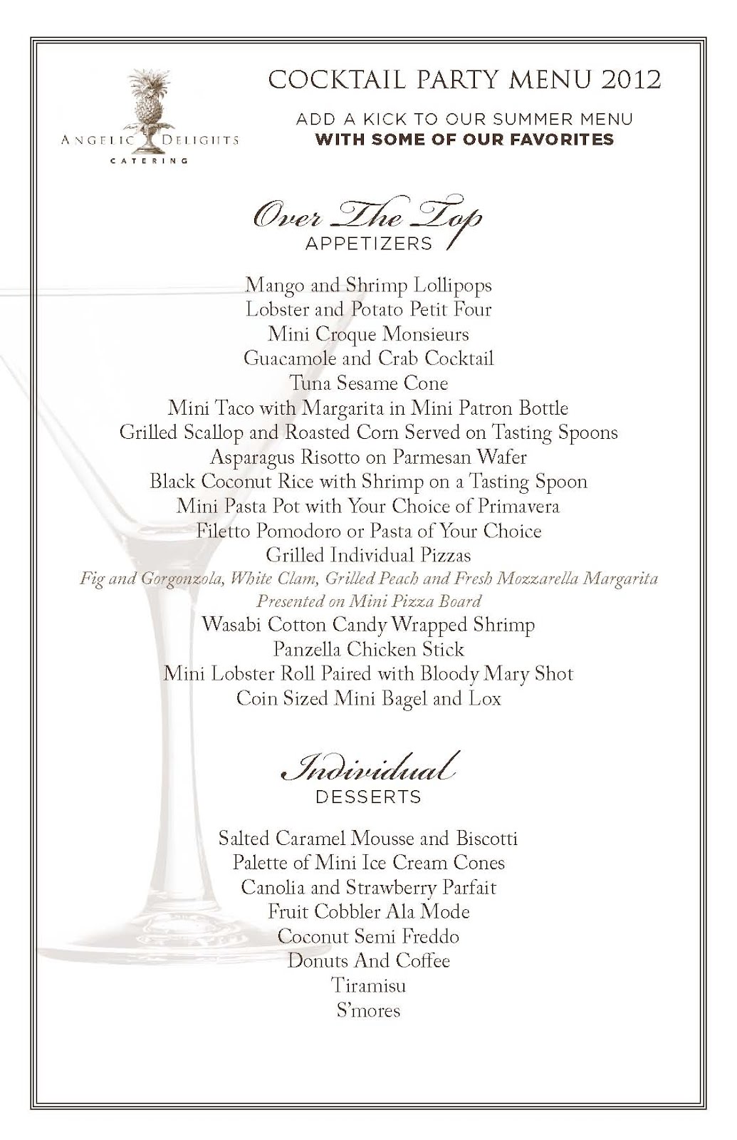 “Over the Top” Summer 2012 Cocktail Menu Check out our new “Over the Top” cocktail menu for Summer 2012! Angelic Delights Catering – Cocktail Menu 2012